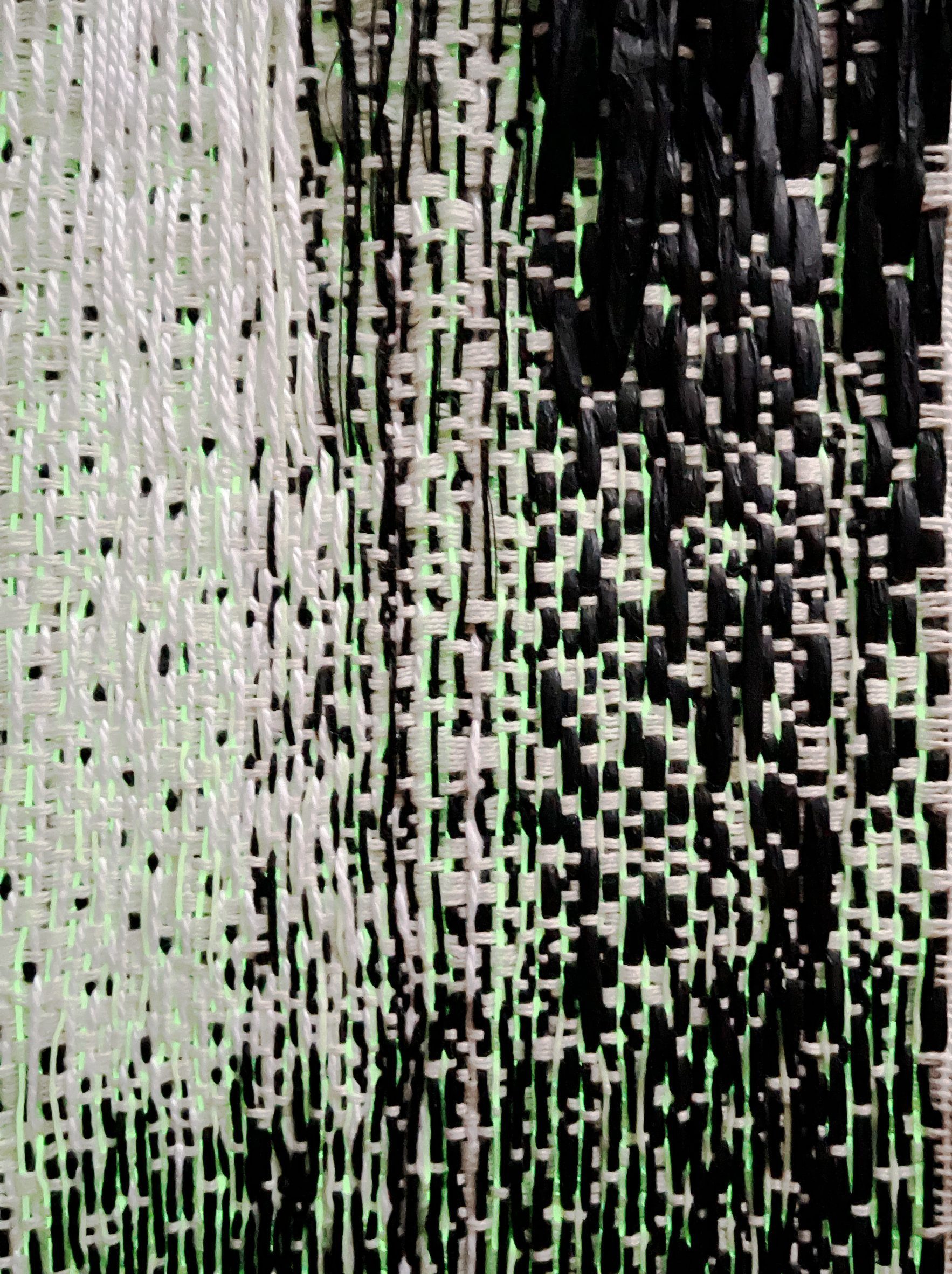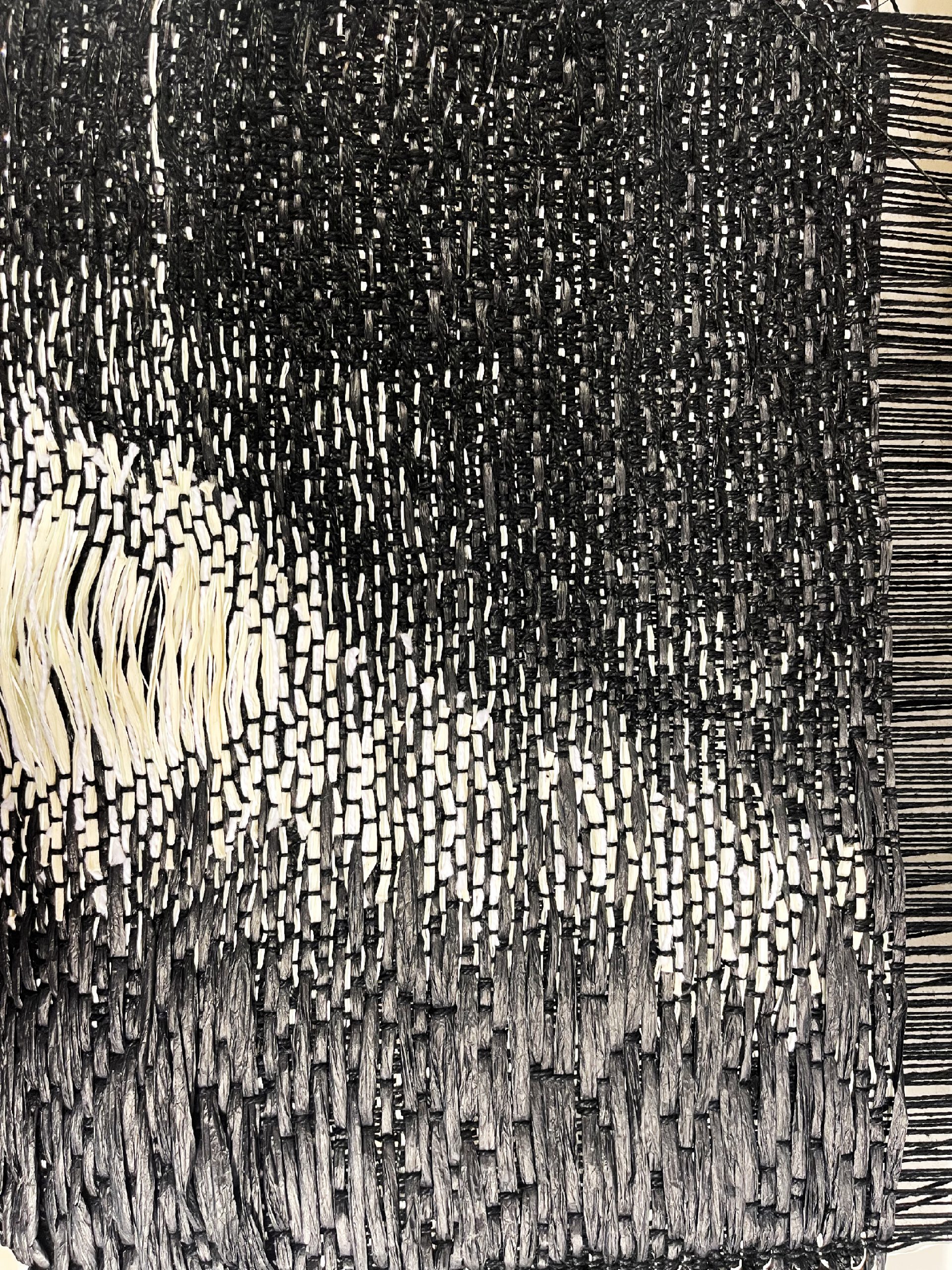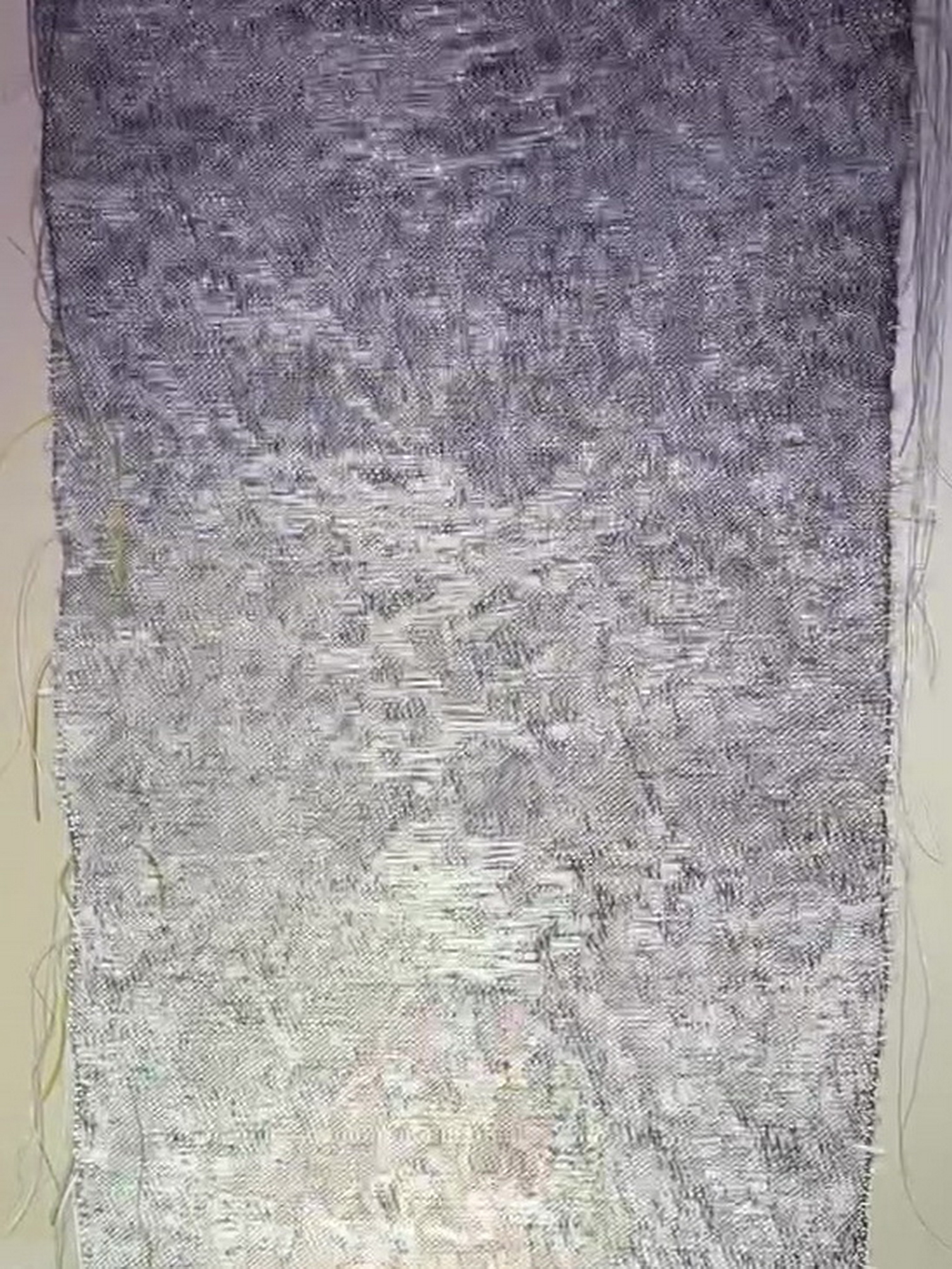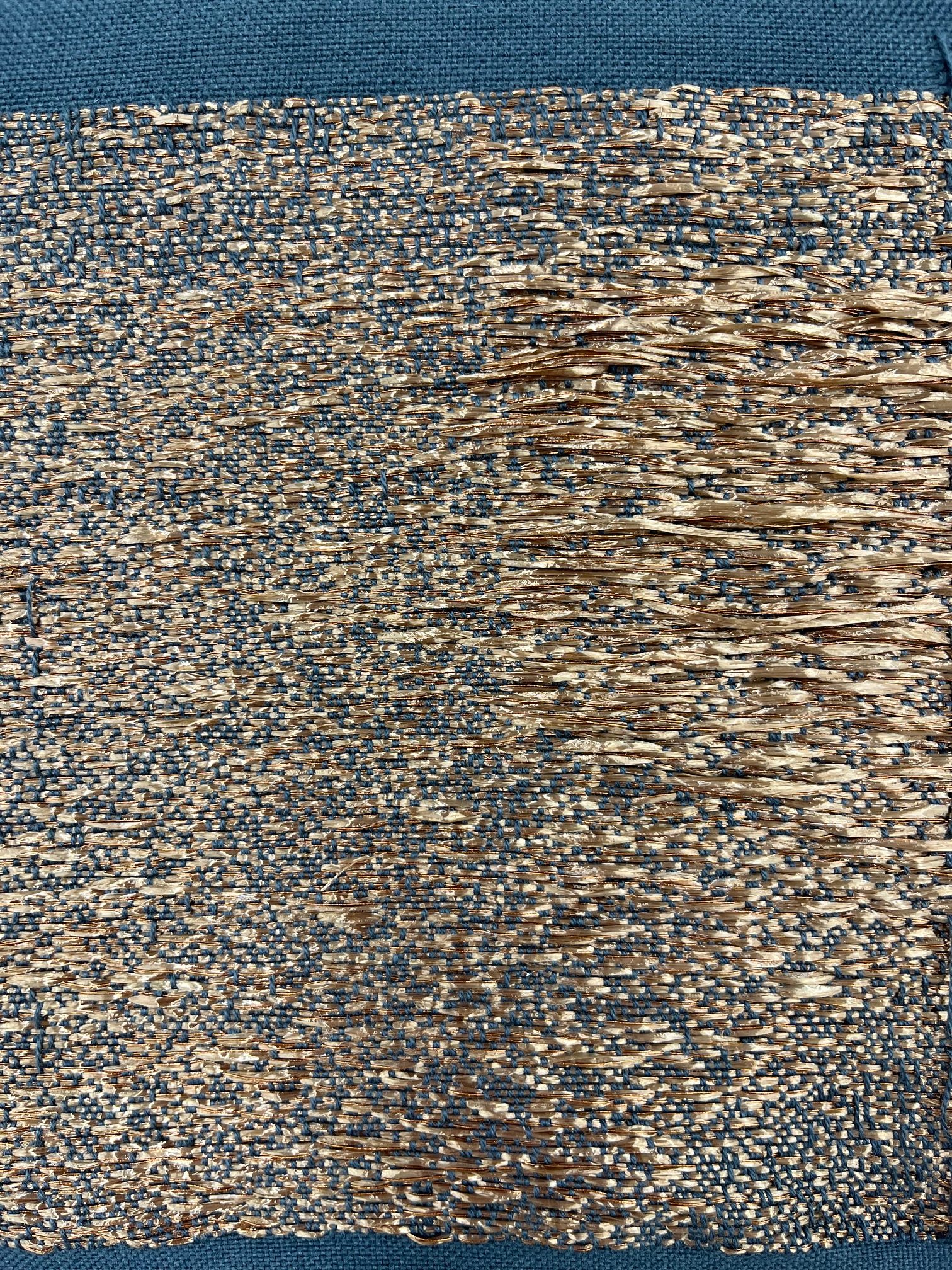 My second effort (first picture from left)) was taken from a photo of mine of a Luis Barragan (Mexican architect) interior. His architectural passion was playing with natural light in simple interiors; my interest is the play of light and light reflective surfaces. The filling here is copper-colored rayon raffia on a black warp, using 5 weaves. The third piece I did is my favorite (second picture from left). It is full width (15”) and is about 6′ long. The image is from a photograph I took of sunshine on water, using 7 satin weaves. But the fun part was using light reflective Metlon yarn, silver gimp, and transparent tape for filling. It shimmers in even light, but flares when a spotlight is introduced. Just the effect I was after! The last picture (on the right), is a small last minute experiment (copper raffia again) which may turn into something eventually. I send thanks and everlasting gratitude for this life-changing experience!
