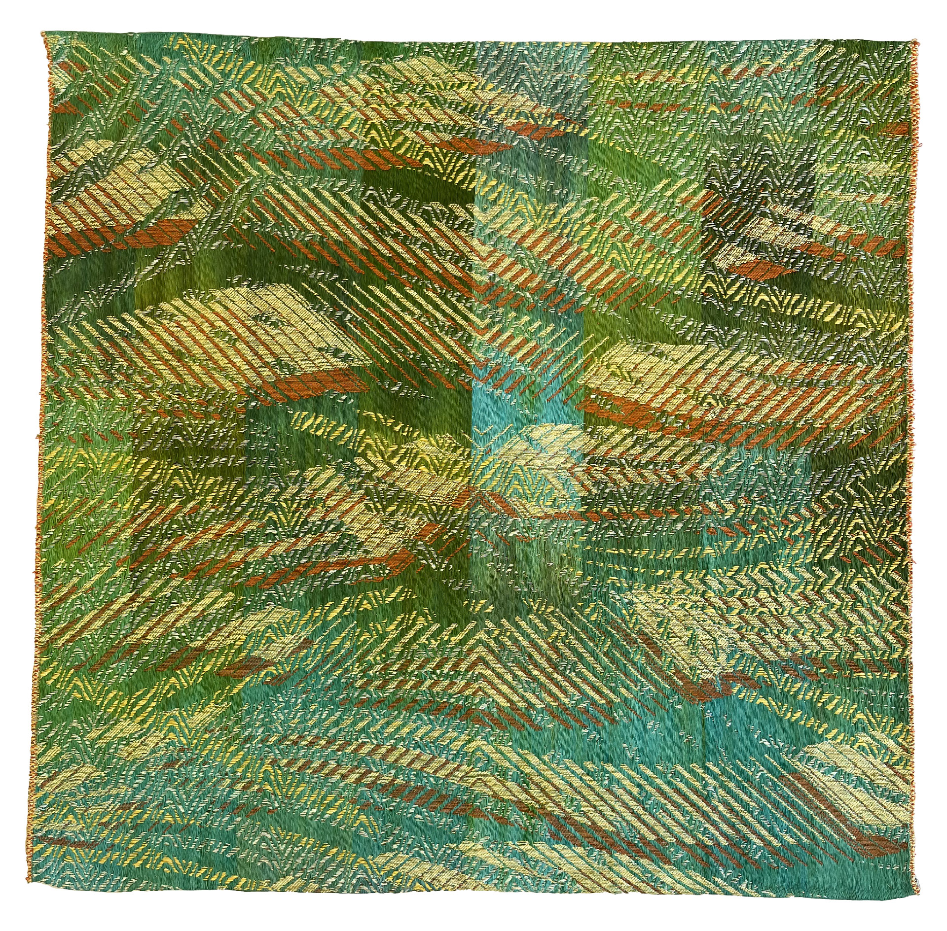 Spending my summer in Norway for three months allowed me to dive deeper into technical and conceptual aspects of my work. I had more time to experiment with new weave structures at DWN and learned how to properly back my weavings using double-weave and primarily weft-faced structures. I also learned how to thread a 12 module, 4 wide loom and warp it with 10 yards of painted warp! Some of my newer complex structures are seen in the photo above, which is an undulating twill combined with a straight twill using three weft insertions. I used this pattern to help create more textural variation and emphasize the movement of these pronounced waves.