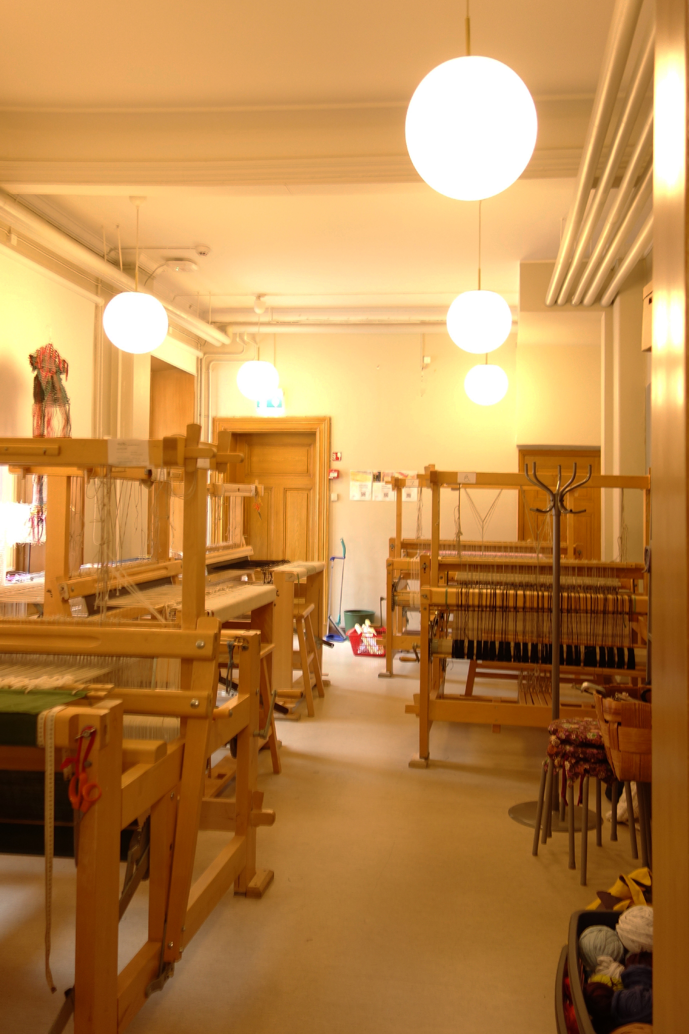 Looms, dying facilities, sewing-, knitting- and embroidery-machines can be used by the students as they like. Individual workspaces and self-determined spaces for interaction are spread out. Erasmus exchange student Lisa, appreciates the Nordic feelgood atmosphere, just like we instantly did.