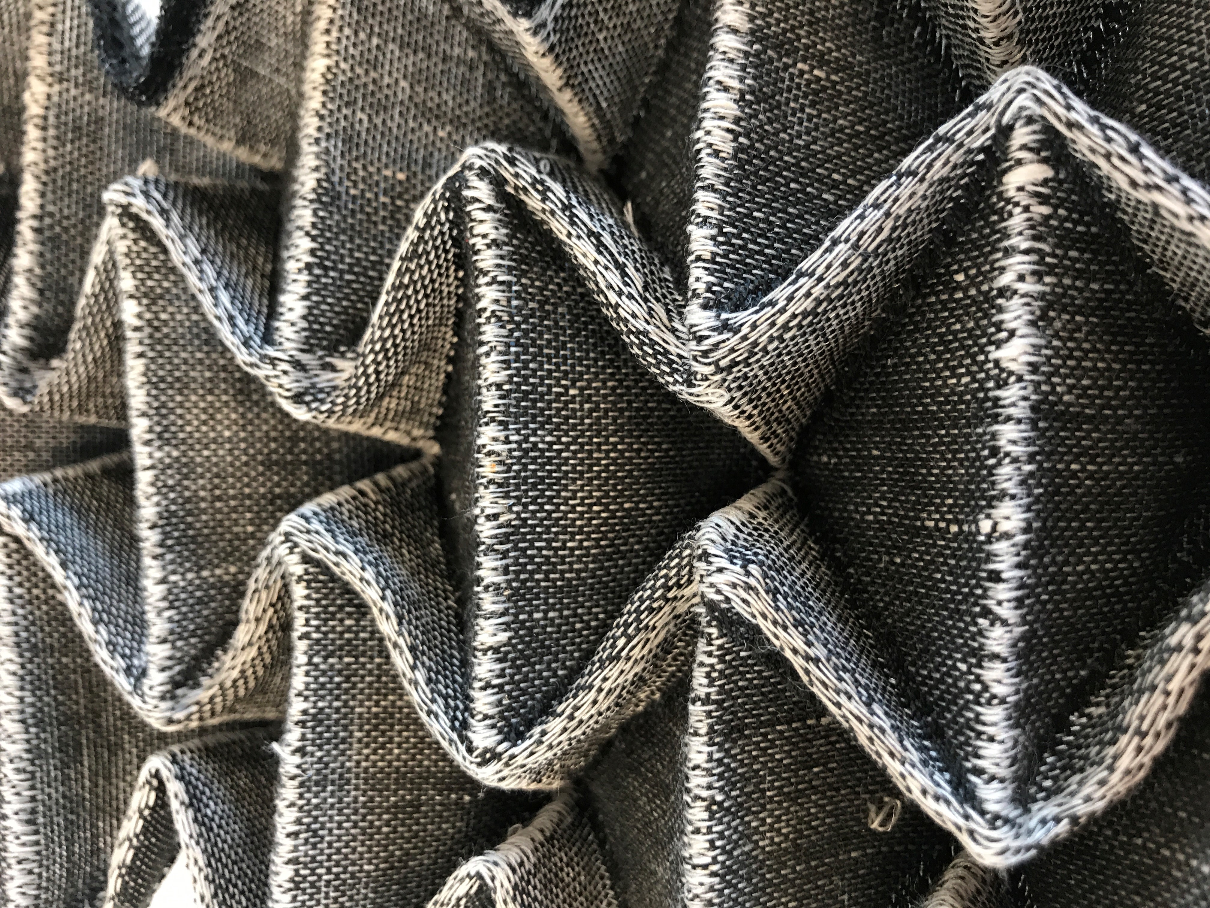 After taking the double weave fabric off the loom, she creates dimension by washing, drying, ironing, and boiling the fabric to shrink the cotton warp and permanently pleat the polyester weft. This process creates a fabric that has movement but still holds the memory of the origami folds.