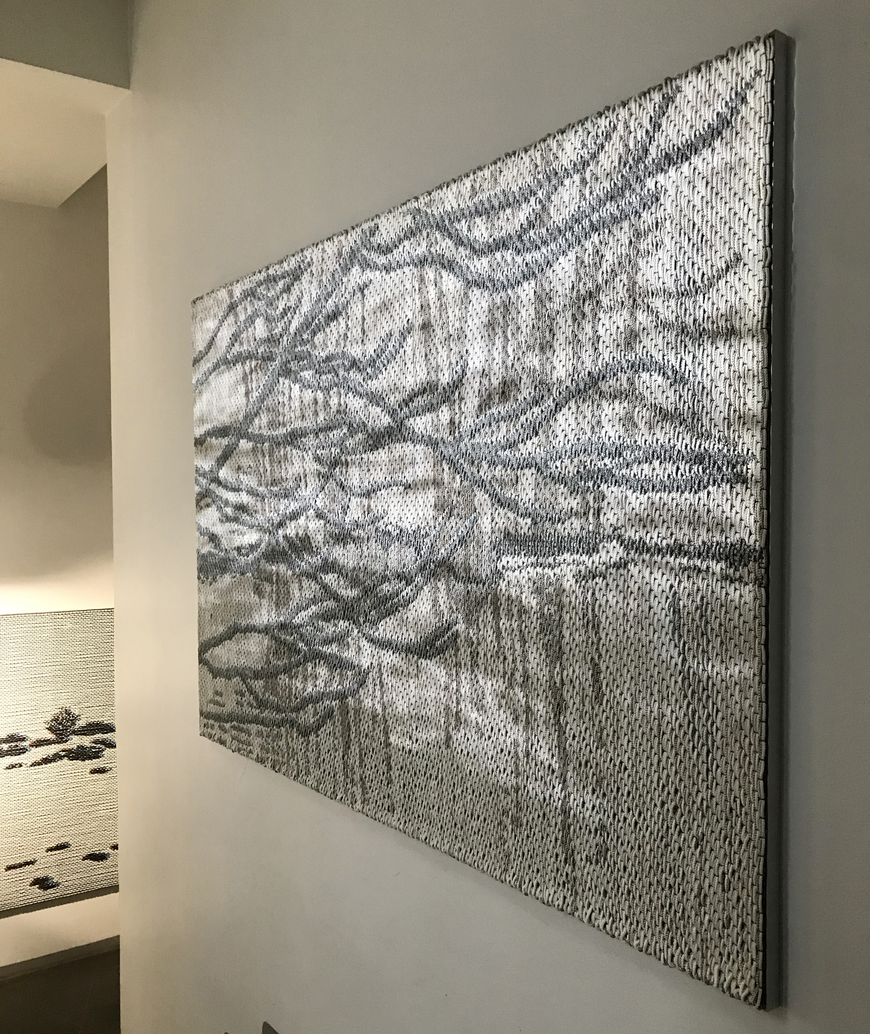 Three other weavings shown in the exhibition – Presage, The Piper and Cadence – as well as above introduced ones, all have a range of motion or additional dimension to them. The very reference is reminiscent of the renaissance tapestries, which I go to study in museums whenever in Europe. Back in the day, one can only imagine how the rooms would have come alive when silver or golden yarns, woven into large tapestries, would reflect the candles or other glittering lights.