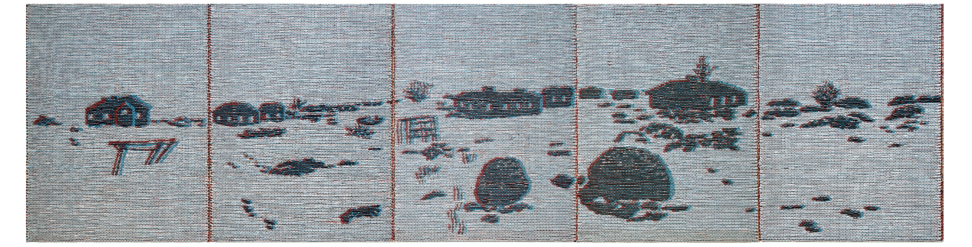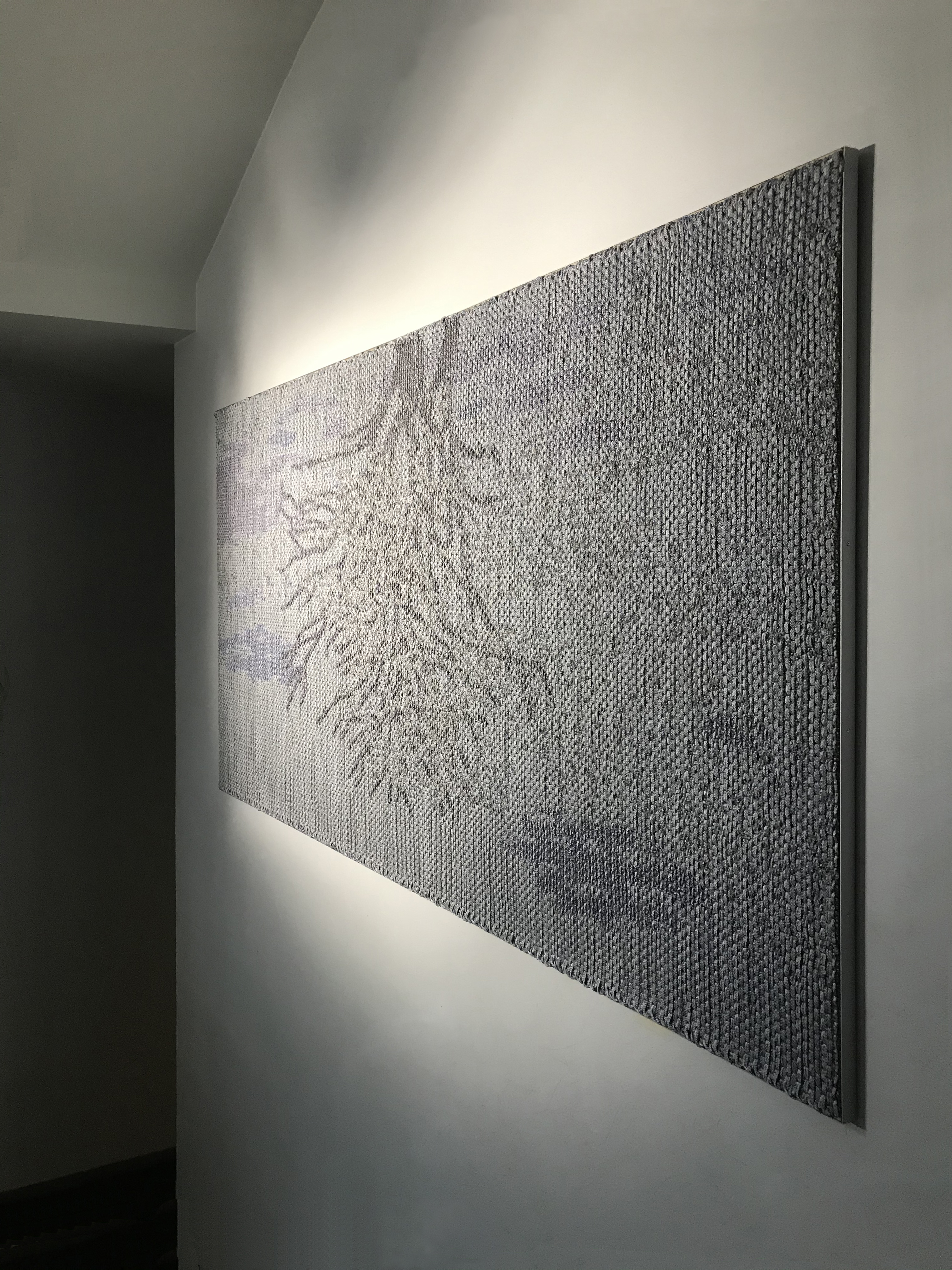 The works that are showcased in my ongoing exhibition are a result of the Jacquard Weaving experimentations on my TC1 loom over the last three years. And for this exhibition, the five woven artworks were chosen by Curator and Professor Emerita ( NTNU ) Maaretta Jaukkuri and besides that, she has also made the beautiful exhibition plan! Titled Weeping Willow and Utö – Yta , these two projects were completed this year, with the support of Arts Promotion Centre of Finland. Weeping Willow is like a grandmother’s encircling arms, whereas Utö – Yta shows an open view from the Southern-most island of Finland, surrounded by the Baltic Sea. The binding used in both these pieces is Taquette because it gives the right scope and simplicity for the thick and grainy-looking materials used.