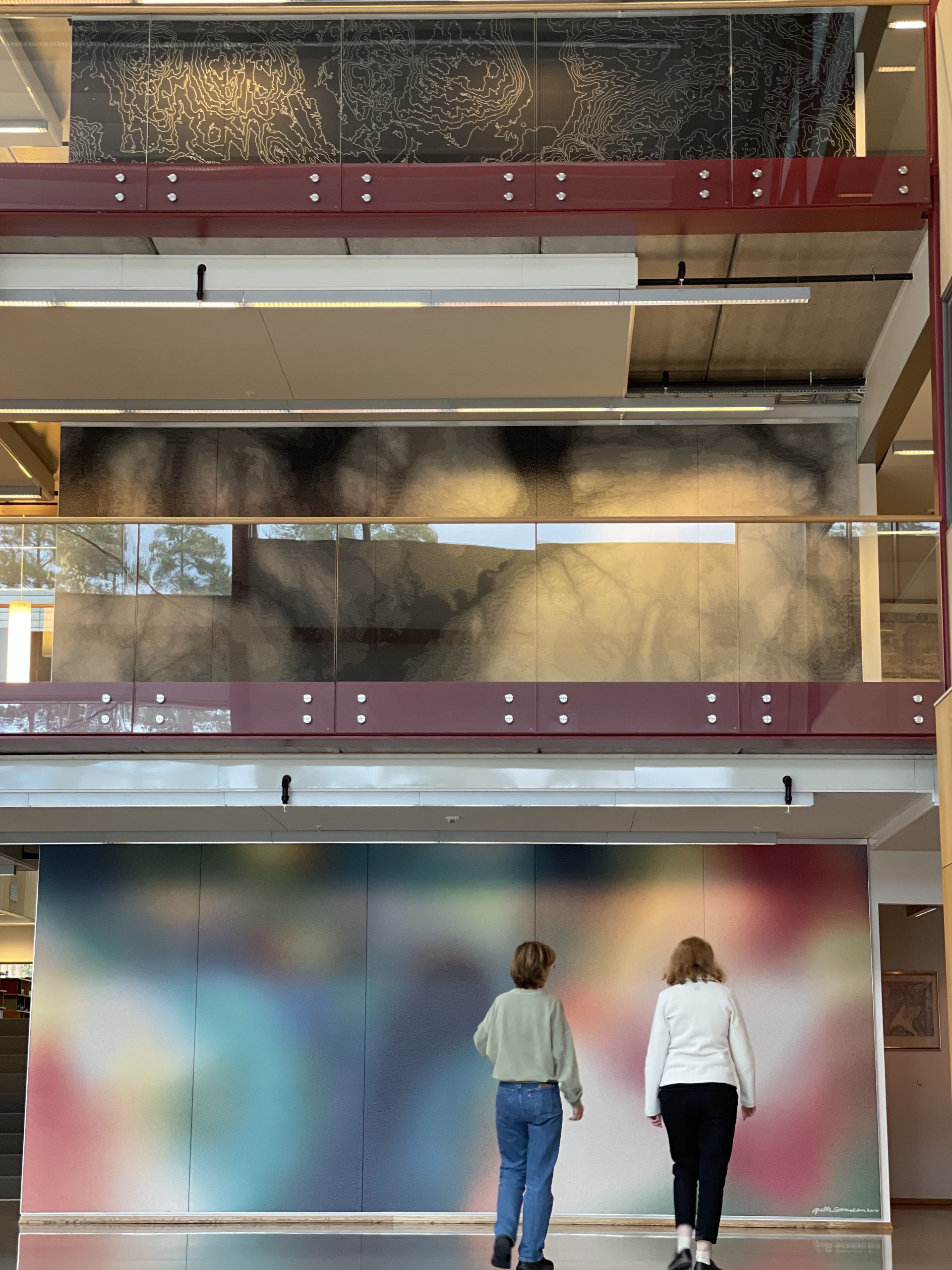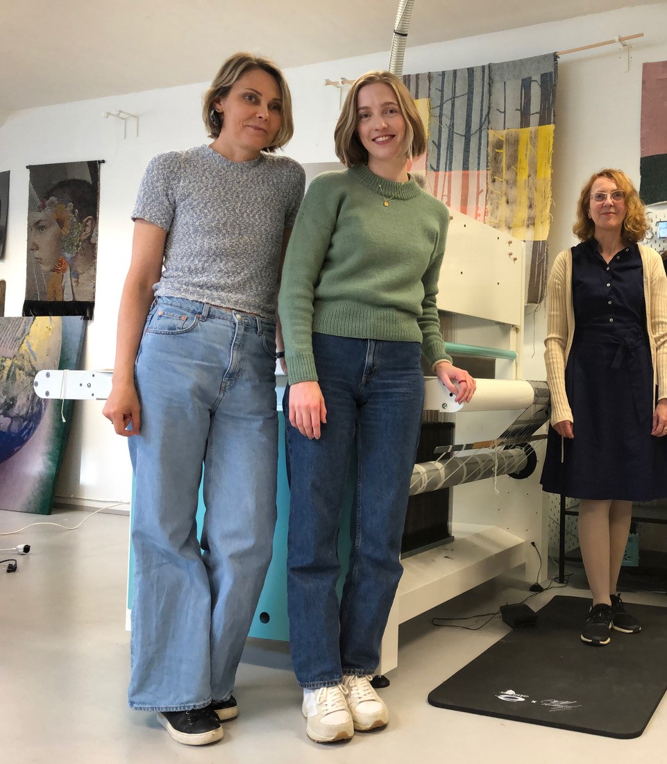 Together with Vibeke Vestby and Geetika Nautiyal we had much exchange and a fabulous guided tour through Tronrud Engineering Technology Park at Eggemoen. “Putting Ideas into Practice”, Tronrud’s motto, is especially true for the TC2 loom communities! This was demonstrated at the Tronrud headquarters where they have 3 large, site-specific woven works by Danish artist Grethe Sørensen, featured on 3 floors in the spacious entrance hall. Another large woven and site-specific work in the lobby is by Lise Frølund from Denmark: It’s background theme has references to the typical pine forest landscape on the Eggemoen plateau. All works had been prototyped on TC1 looms, and Lise Frølunds’ piece was also woven on the TC-1.