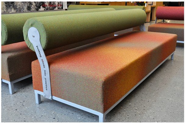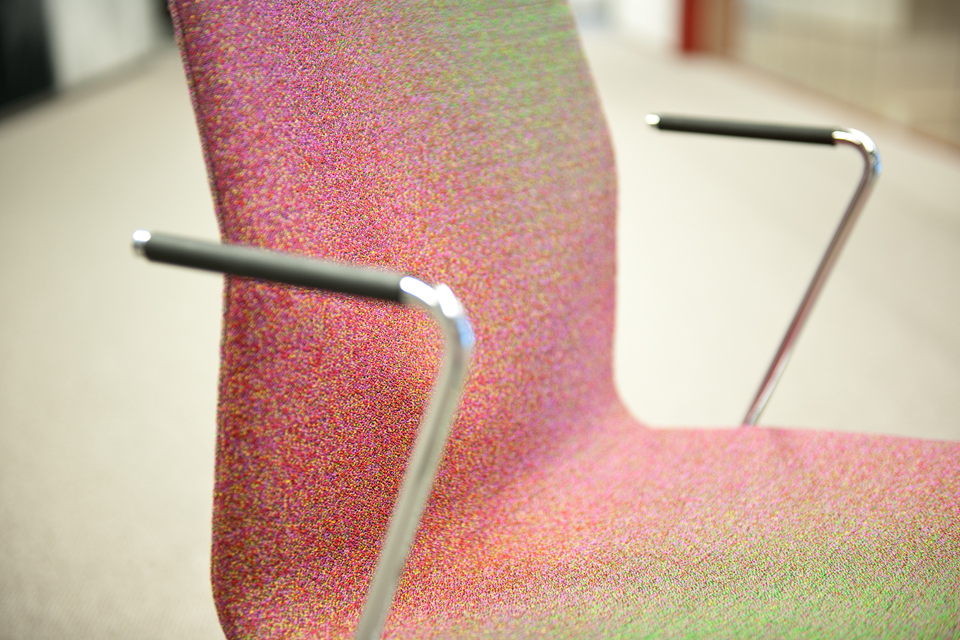 Tronrud Engineering had upholstery fabrics developed by Grethe Sørensen, both in the lobby area and in the office spaces: The two-colored jacquard upholstery fabric is named Interference, and was awarded the Red Dot Design Award some years ago. Then it was distributed by Kvadrat. Another very colorful upholstery design is named Millions of Colors, and was distributed by Maharam in the USA. The whole complex of Tronrud headquarters and production buildings was designed in 2008 by the Norwegian Snøhetta Architects: They made very contemporary spaces with a mixture of open plan and secluded office spaces, with purist color schemes and a variety of glass, steel, stone and wood materials. The digitally woven textile works of 2011 extend the complex presence of the headquarter building.